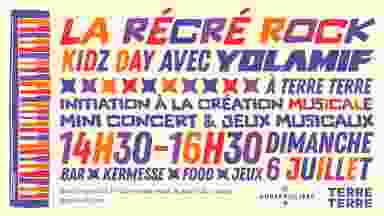 🎸 Kidz Day : Récré Rock avec Yolamif 🗓 Dimanche 6 juillet • 14h30 → 16h30 📍 Terre Terre – Quai François Mitterrand, sous le pont du Landy – Aubervilliers Comme chaque mois, une journée rien que pour les enfants à la ferme ! 🧒🎶 La Récré Rock, c’est un concert festif, ludique et interactif pour enfants, porté par le groupe de rock Yolamif (en concert la veille au soir à Terre Terre sous les étoiles ✨). 🎵 Programme de la Récré Rock : 🎲 Jeux musicaux sur de la musique live 🎧 Initiation à la création musicale : concert / création d’un morceau 🎤 Mini concert live avec Yolamif ! 🍹 Bar – 🥞 Food – 🎯 Jeux sur place Gratuit et ouvert à tou·te·s ! ---------------------------------- 🌸 Terre Terre en vue !🌸 Terre Terre est la 3ème ferme urbaine créée par l'association la SAUGE ! Située au niveau du pont de Landy à Aubervilliers, cette ferme urbaine de 3000 m2, co-construite par les habitant.es et les acteur.rices du territoire a vu le jour début 2020. Terre Terre est un lieu de production agricole participatif, où l'on vient s'exercer à la pratique du jardinage ou simplement flâner au milieu des espaces de culture. 🌱 La SAUGE 🌱 La SAUGE est une association qui depuis 2015 agit pour réaliser sa mission : faire jardiner le plus de monde possible 2h par semaine de manière respectueuse du vivant. Elle crée des fermes urbaines, des jardins partagés, des programmes pédagogiques, cultive des plantes et graines et organise des événements culturels pour tous et toutes. 📍 ACCÉDER À TERRE TERRE Terre Terre – Quai François Mitterrand (sous le pont du Landy), Aubervilliers 🕧 Horaires : Vend : 18-22h • Sam : 10-22h • Dim : 14-22h 🚲 10 min à vélo depuis La Villette (parking à vélo sur place) 🚇 Métro 12 : Mairie d’Aubervilliers 🚆 RER B : La Plaine Stade de France 🚌 Bus : 45, 173, 35, 239, 150 👉 Terre Terre vous ouvre ses portes pour découvrir son jardin au bord du canal et partager un moment convivial en plein air