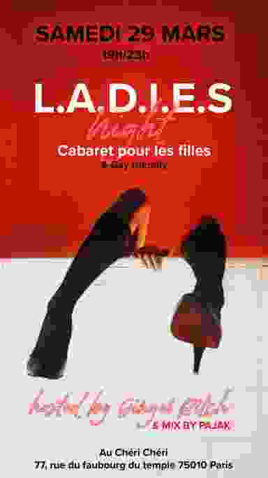 Soirée Cabaret "L.A.D.I.E.S night » au Club Chéri Chéri – Un Événement fait pour vous les filles, TOUTES les filles, lesb/bi/ trans et alliées! Rejoignez-nous pour une soirée inoubliable au cœur de Paris, au club Chéri Chéri, où la magie du cabaret rencontre l'énergie vibrante de la scène Queer! Ginger Bitch, reine emblématique de la saison 2 de Drag Race France, en Madame Loyale, vous accompagnera tout au long de cette soirée, dans une ambiance chaleureuse, mêlant humour, glamour et Amour! Quand : Samedi 29 Mars, 19H-23H Où : Club Chéri Chéri, 77 rue du faubourg du temple 75010 Paris Au programme : Performances drag, chant live & shows, mix by Pajak, et d’autres surprises…. Laissez-vous emporter par la folie de nos artistes, qui vous feront vivre de nouvelles expériences , où chaque performance est une célébration de l'identité et de la fierté. Planches mixtes et happy hour sur les boissons et cocktails préparés par notre super staff! NB: Nous accueillons exceptionnellement nos ami.e.s Gay, Gay Friendly, Queer…et cela dans le respect de chacun.e et en toute bienveillance! Réservez vos places dès maintenant! Infos pratiques: métro ligne 11 arrêt Goncourt vestiaire obligatoire sécurisé à l'entrée