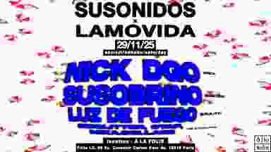 ‎‧₊˚✧ LAMOVIDA x SUSONIDOS ★ A LA FOLIE ★ 23H-06H ✧˚₊‧ 🪩 12 € - tarif régulier 💋 29 € - beso de tres : trois billets pour toi et tes potes ‎‧₊˚✧ LINEUP ✧˚₊‧ NICK DGO [MEX] SUSOBRINO [BOL/BE] LUZ DE FUEGO [BR/FR] DIEGLITTER [MEX] OTAP [COL] MIKA.COLLAGE [BOL] LAMOVIDA, collectif latino-américain créé par quatre ami·es originaires de Colombie, Bolivie et du Mexique. Notre objectif est de créer un espace au sein de la scène musicale parisienne pour donner de la visibilité aux talents de notre continent. De plus en plus de producteurs et productrices d’Amérique latine nous inspirent avec des créations innovantes et hybrides, mêlant les sonorités traditionnelles aux influences électroniques contemporaines. À travers LAMOVIDA, nous souhaitons mettre en lumière ces voix émergentes, leur offrir une plateforme d’expression et les soutenir dans leur parcours artistique.https://www.instagram.com/lamovida.paris/ Pour cette occasion spéciale, on a décidé de tirar la casa pour la ventana, et de s’associer avec SUSONIDOS pour vous proposer une soirée de LOCURA. SUSONIDOS, label et une série d’événements solaires🌞 (en journée) et lunaires🌚 (en soirée), célébrant les artistes latino-américains du monde entier. Musique, cuisine, danse, connexion. Un espace pour écouter, ressentir, partager et apprendre. Un pont entre l’Amérique latine et l’Europe, construit avec du rythme, du cœur et de la comunidad. https://www.instagram.com/susonidos/ Nick DGO, producteur basé entre le Texas et Mexico, est en train de redéfinir la scène musicale mondiale avec des morceaux qui incarnent son identité sans frontières. Élevé entre les paysages sauvages du Durango rural et le Dirty South texan, il forge un son rebelle, fusion audacieuse de genres qui reflète ses racines. À travers sa musique, Nick DGO crée un espace sonore où le rap et la pop du Sud rencontrent la musique régionale mexicaine et l’électronique — un mélange brut et avant-gardiste, véritable reflet de son parcours et de son expression libre et assumée. https://soundcloud.com/elnickdgo / https://www.instagram.com/elnickdgo/ SUSOBRINO, né en Bolivie, basé à Bruxelles et profondément connecté à la riche scène sonore d’Amérique latine, Susobrino est un artiste musical guidé par le rythme, l’émotion, la curiosité et l’exploration. Son univers sonore mêle des éléments acoustiques et électroniques pour créer quelque chose à la fois ancré et imprévisible. Performances live et DJ sets. https://soundcloud.com/susobrino / https://www.instagram.com/susobrino/ Luz de Fuego, une exploration axée sur la Break et la Bass music. Inspirée de la scène UK et celle du Brésil, c’est sans frontière qu’elle te fera danser sur un mélange de styles allant du Garage au Jersey jusqu’au Latin Club et à la Jungle. DJ franco-brésilienne originaire de Londres, qui a fait ses armes à Paris en prenant conscience des problèmes de représentation des minorités sociales dans les musiques électroniques. Membre de Go Gouine et co-fondatrice du label Mycelium Syndicate, elle cherche à oeuvrer pour davantage d’inclusivité chez les DJ et producteur.ices sur la scène française. https://soundcloud.com/luzdelfuego / https://www.instagram.com/dj.luzdelfuego/ dieglitter, artiste, producteur et DJ mexicain basé à Paris. Dans son univers où le hyperpop et le reggaeton se rencontrent, il donne vie à un monde sonore filtré par le rose fluo. Son style de production mêle couches de synthétiseurs mélodiques et rythmes brisés, influencé par des artistes tels qu’El Guincho, Nick León et A. G. Cook. En 2025, il s’est produit au Primavera Sound avec Restinga, est résident à Radio Relativa à Madrid et a livré un set spécial pour dublab à Los Angeles. Il a également sorti un remix pour CRRDR et Brenda sur le label Trampa. https://soundcloud.com/dieglitter / https://www.instagram.com/dieglitter/ Otap, cofondatrice de LAMOVIDA et originaire de Bogotá, propose des sets hybrides mêlant bass music, guaracha, tribal avec beaucoup des percussions. Elle combine les influences de son enfance latino-américaine avec celles acquises lors de son long séjour à Paris. https://www.instagram.com/_otap__/ https://soundcloud.com/otapp mika.collage est un pont musical entre La Paz et Paris, deux villes où mysticisme et énergie contemporaine se rencontrent. Dans ses sets, il fusionne les rythmes du dembow, et du reggaeton déconstruit avec la vibrance de la techno, tout en mettant en avant une musique électronique latino-américaine avant-gardiste orientée vers le Club. Dans ses sets, il cherche à interpeller constamment ses auditeurs sur ce que signifie être Latino. https://www.instagram.com/mika.collage/ / https://soundcloud.com/collage-musica