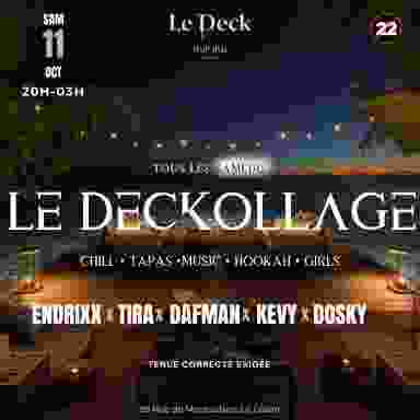 LE DECKOLLAGE –  LE DECK  Tous les samedis  20h00 – 03h00 On se retrouve dans ton nouveau spot extérieur au Gosier. Sur ton deck préféré on va enfin pouvoir profiter, chill , fumer une chicha , boire un cocktail, fêter entre amis Toujours la vibe que tu préfères : Hip-Hop & Caribbean Music. Nos résidents aux platines : DAFMAN • KEVY • LISTENDAT • TIRA • PELUCHE • MICKA • DOSKY Interdit au moins de 22 ans . Tenue correcte impérative La direction se réserve le droit d’entrée
