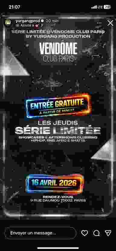 🔥 LES JEUDIS SÉRIE LIMITÉE 🔥 Showcases & aftershows clubbing au Vendôme Club Paris 💎Ambiance Calibrée Hip-hop, RnB, Afro & Shatta ✨ Entrée gratuite à partir de minuit 🎟️ Sur invitation via ICI ☀️ Dress Code ? 😜 Viens comme tu aimes, mais en mieux