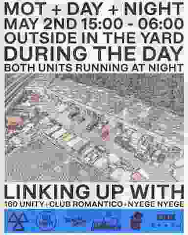 We'll be transforming the outdoor yard for an open air event in the day on May 2nd, which will then follow into a double unit event for the night. We'll be linking up with 160 Unity, Club Romantico & Nyege Nyege for the occasion. Supported by Edwin Supply.