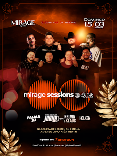 A Mirage Sessions chega com uma mistura perfeita de pagode e DJs pra fechar o final de semana do jeito que a gente gosta: música boa, pista cheia e aquele clima que só o domingo da Mirage tem.