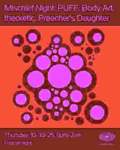 PUFF invites you to board the Jupiter Disco spaceship for a night of mischief. Playing alongside Body Art, Theoretic, and Preacher's Daughter, expect a phantasmal mix of ephemeral groove, dark dub, and wavy disco on this spooky eve. Free all night. __________ Jupiter Disco is a safe space for all. Our most important goal is to ensure everyone who steps into our space feels welcome and safe. In order to achieve this goal, it's mission critical that everyone approaches each other with respect. That means everyone. We are passionate about bringing people together and building connections between participants in and adjacent to our community. Go ahead and say hi to someone new while you're here with us! If you see or experience anything that makes you feel uncomfortable, please alert one of our team members and we will coordinate a resolution immediately. We encourage everyone to be present and interface with the physical elements around you while you're with us, so we ask that you please limit your phone use throughout the space. Phone screen and camera lights can also be distracting, so please be mindful of the brightness and the length of time you use those lights, if at all. If you intend to smoke (anything), please take a break outside and take a few steps down the block. Don't worry, we always have re-entry.