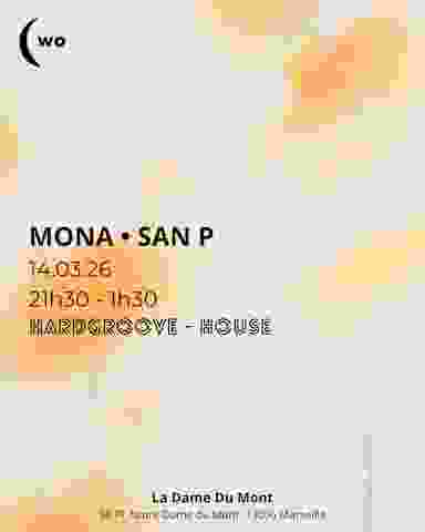Un voyage entre la house et le hardgroove avec les DJ San P et Mona. San P est une DJ marseillaise d'origine, musicienne et guitariste de formation. Après plusieurs années consacrées à la pratique instrumentale, elle se tourne depuis récemment vers le DJing et le microsillon pour proposer une sélection à large bande. Ses sets se tournent aussi bien vers la house que la minimale et progressive. San P est membre des collectifs marseillais MTown et la WO. Originaire de la côte d'Azur, Mona est une DJ émergente de la scène techno française. Elle début le mix en 2024 au sein du collectif CICADA, où elle forge ses premières armes dans l'univers de la hard techno. Rapidement remarquée pour ses sets puissants et son énergie contagieuse, elle décide de faire évoluer son style vers une techno plus groovy, afin d'atteindre un public plus large tout en restant fidèle à ses racines underground. Aujourd'hui, Mona explore un univers techno/hardgroove inspiré par la scène berlinoise et ses basses percutantes, mêlé parfois à l'intensité d'une trance hyper énergique. Cette signature sonore unique lui ermet de créer des sets à la fois intenses, dansants et fédérateurs.