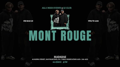 Friday, March 20th All I Need Events & Le Club invites you to a special night with MONT ROUGE [AFRO HOUSE ] at MadaRae. ► LINEUP MONT ROUGE [ AFRO HOUSE ] TBA TBA TBA ► GUEST LIST, TICKETS & TABLES For Bottle Service and Table Reservations, please text: 📲 (415) 684-5045 All ticket sales are final and non-refundable. ► FOLLOW US Instagram: @allineedevents Facebook: @allineedevents ► HEADLINER BIO MONT ROUGE is a Swiss duo shaping the new wave of electronic music. With deep synths, hypnotic grooves and real emotion, they’ve hit 18M+ streams, earned support from legends, and played over 120 shows worldwide. And they’re just getting started.Mont Rouge is a Swiss-based duo redefining the pulse of modern electronic music. Born from an instant creative spark in the studio, their chemistry quickly turned into something magnetic. In just two years, they’ve carved their own path on the global scene, crafting a sound built on deep synths, hypnotic grooves, and the kind of emotion you can actually feel. In 2024 only, Mont Rouge surpassed 18M streams across all platforms and gained support from Adriatique, Diplo, Keinemusik, CamelPhat, Swedish House Mafia and more. With over 120 shows last year, worldwide, including debut performances in Asia early 2026, their impact keeps growing. MadaRae Nightclub 46 Minna Street, San Francisco 9PM – 3AM | 21+ with valid ID #LETSDANCE