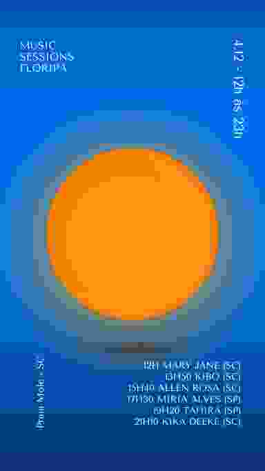 Music Sessions Floripa é liberdade, é estar presente em lugares inusitados com os amigos num evento exclusivo, é curtir um bom som numa energia única. Somos isso e movidos por isto! Nosso primeiro encontro foi lindo demais, a beira da Lagoa da Conceição, um público maravilhoso, todos vacinados, e desta vez não vai ser diferente. Nosso próximo encontro vai acontecer no dia 6 de Novembro num local a beira da Praia Mole, com acesso somente pela areia, um diazão de praia, de sorrisos, de amor e de alegria. Na parte musical, teremos um time da pesada composto por: 12:00 - Mary Jane (SC) 13:00 - Kibo (SC) 15:40 - Allen Rosa (SC) 17:30 - Miria Alves (SP) 19:20 - Tahira (SP) 21:10 - Kika Deeke (SC) 23:00 - Encerramento O local será divulgado 24 horas antes do evento. Evento destinado para pessoas que tenham tomado ao menos uma dose da vacinação contra covid-19. Apresentação obrigatória da carterinha de vacinação (física ou digital) na entrada do evento. Não será permitida a entrada caso não apresente a mesma.