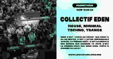 Le Collectif EDEN c’est “juste un verre” qui finit à 6h du matin ! C’est l’after improbable auquel tu prends goût ! C’est la guirlande de noël qui scintille toute l’année ! C’est le bouchon de champ’ qui saute ! C’est le souffle des basses qui caresse ta joue ! C’est le rendez-vous des gens bien, prêts à donner du love ! Mais surtout EDEN c’est, le respect comme base solide et la bienveillance comme seul étendard.