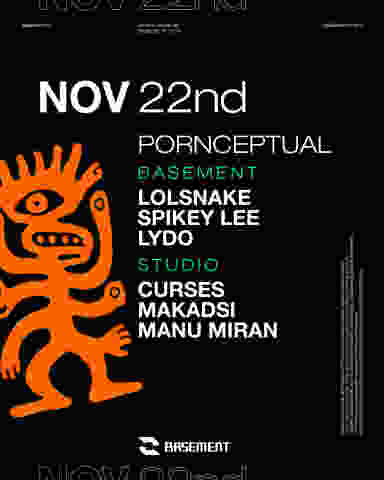 LOLSNAKE headlines their first NY edition of Pornceptual. The Iraqi-American DJ is one of the founders of Weeeirdos, a uniquely special jewel in the Berlin nightlife calendar. Crafting a devious sound with unrelenting momentum, LOLSNAKE drives their point home with a headbanging intensity that can just as easily swerve into the ethereal and exploratory. It’s a perfect encapsulation of her party’s ethos of “fun and freedom.” Spikey Lee makes his debut at BASEMENT. A denizen of the German queer techno underground, Spikey Lee is a regular at Pornceptual’s German editions as well as spiritually aligned events like Gegen, Hamburg’s Kinky Sundays and more. Rooted in the harder edged sounds, Spikey Lee bites into a mouthful of manic fun at the bleeding edge of techno. BASEMENT resident Lydo joins the collective. Representing the fertile overlap between the febrile and the tactile, Lydo’s constantly-evolving craft has taken them from the anthemic to the cool and cerebral. And it always hits.