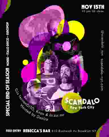 Get ready to groove at the ultimate Italo Disco & House bash known as Scandalo NYC. Prepare for a whirlwind of the Scandalo NYC Style, where infectious Italo Disco vibes collide with captivating Classic House beats and irresistible Euro Pop. Get ready to dance with resident DJ fernanDITO and guests Knox & lo.ko.no Host Desira invite you to join the fun-filled celebration, where everyone is welcome to dance, laugh, and make new friends. Whether you're coming with a crew or flying solo, the dance floor beckons for an unforgettable night of music and fun. FREE ENTRY