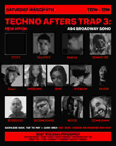 This is our 3rd TECHNO AFTERS TRAP As with previous afters the lineup is curated for dark music. Dark music evokes feelings of sorrow, despair, hate, and other negative emotions. It's a reminder of the human condition. Common elements include haunting melodies, ethereal vocals, and unnatural sounds. Every genre from pop to industrial hardcore has a darker sub-genre that falls under "dark music". This event will feature the following genres in particular: Acidcore Acid trance Dark techno Hardcore Hard groove Hard techno Hard trance Hypnotic Industrial trance Minimal Neo-rave Psytechno ■ No tables on the dance floor. ■ Zero tolerance for harassment. ■ Let us know if you need help.