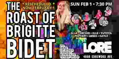 Join us Sunday, February 1st from 7:30-9pm for roasting, lip syncs, and queer comedy, celebrating the reason for the lesions, Brigitte Bidet.