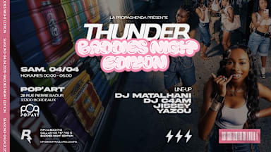 La Thunder - Édition Baddies Night La Thunder revient avec une édition spéciale : Baddies Night. Le samedi 4 avril, rendez-vous au POP ART pour une nuit où ce sont les femmes qui prennent le contrôle. Talons, silhouettes affûtées, regards qui en disent long. Même exigence, même ADN: du style, du caractère et une ambiance calibrée. MUSIC : * RAP FR / US * AFRO - AMAPIANO - SHATTA LINE UP : * DJ C4am * DJ Matalhani * Yazou * Jissey 🎫 ENTRÉE : 10€ en prévente et 15€ sur place DRESSCODE: Fashion-street ( Pas de jogging, pas de short, pas de casquette, pas de bonnet) BOOKING : +33 7 67 71 62 13 //ABONNE TOI À LA PAGE SHOTGUN "La Propaghenda" POUR BÉNÉFICIER D'AVANTAGES EXCLUSIFS// - - - Accès - - - POP’ART - 28 rue Pierre Baour, 33300 Bordeaux Ⓜ️ Tram B arrêt Berge de la Garonne 🕕 Horaires : 0h00 à 6h00