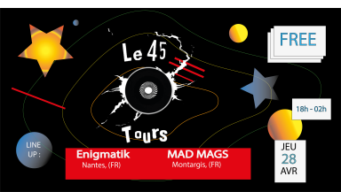 Jeudi soir 100% Techno avec le Nantais Enigmatik & Mad Mags ! ------------- LINE UP ------------------ Enigmatik FB: https://www.facebook.com/enigmatik.dj SC: https://soundcloud.com/enigmatikdj Mad Mags SC: https://soundcloud.com/madmags7 ------------ INFOS PRATIQUES ---------- Entrée gratuite Le 45 Tours - Bar / Restaurant / Miniclub 45 Rue de Montreuil 75011 Paris M8 : Faidherbe-Chaligny M9 : Rue des Boulets M16 A , RER : Nation