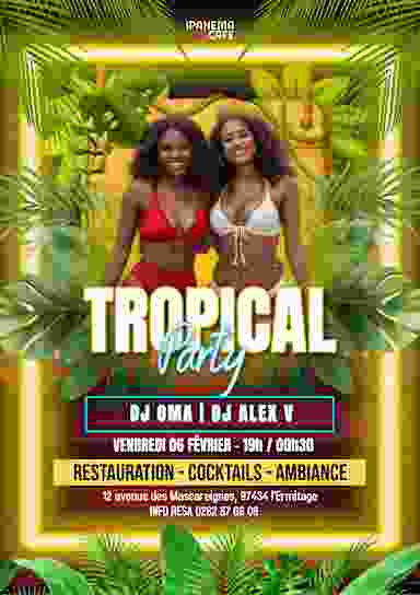 🌺 TROPICAL PARTY 🌺 Prépare-toi à une soirée 100% vibes tropicales 🌴🔥 Palmiers, couleurs chaudes, cocktails exotiques et une ambiance solaire pour te faire voyager sans quitter la piste 💃🏽🍹 🎧 Aux platines : DJ OMA & DJ ALEX V 📅 Vendredi 06 février ⏰ 19h – 00h30 📍 IPANÉMA CAFÉ - 12 Avenue des Mascareignes, 97434 l'Ermitage 📞 Infos & réservations : 0262 87 06 06 🍽️ Restauration 🍹 Cocktails 🔥 Ambiance tropicale garantie