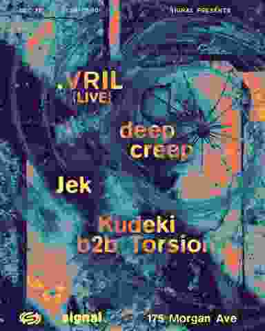 Slither and slide into this night and get yourself settled into the low end. Local DJ/producer and founder of the pi pi pi mix series, deep creep opens with acidic pulses and low-lying modular textures, shaping the floor with careful momentum and her signature of precise restraint. With ease and silky smooth transitions she passes off duties to Jek, who adds offset percussive tension and precise rhythmic dissonance to the night’s mix, that’ll push the vibe into unexpected, inebriating, grooves. The air is right for a shadowy German producer, VRIL, to enter the scene with a live set. Known for his hypnotic, bass-heavy techno, deep repetition, and immersive tension, you can expect an experience that feels thick and tactile as it physicals shifts the energy in the room Kudeki and Torsion close b2b, cycling through industrial-tinged rhythms and meticulous sequencing that hold the floor in tight, kinetic lock from start to finish.