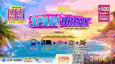 Découvrez l’Espagne avec le SPAIN BREAK 2026 ! Suite au succès des précédentes éditions, le Spain Break revient en 2026 pour une nouvelle édition en Espagne. Direction Lloret del Mar, pour plusieurs jours au soleil entre étudiants : plage, piscine, soirées, pool party et une ambiance unique, le tout dans un cadre festif et dépaysant. Que tu viennes entre amis ou en solo, le Spain Break est l’occasion parfaite de t’évader, de faire des rencontres et de vivre une expérience étudiante inoubliable. L’Espagne n’attend plus que toi. Le Spain Break 2026 est de retour. 📍 Destination : Lloret del Mar (Espagne) Située sur la Costa Brava, Lloret del Mar est l’une des destinations étudiantes les plus populaires d’Espagne. Entre plages méditerranéennes, piscines, centre animé et vie nocturne réputée, tout est réuni pour vivre une expérience intense et conviviale. Sur place, tu pourras profiter : • des plages et de la piscine de la résidence • du centre-ville animé • des bars, clubs et lieux festifs • ou simplement te reposer et profiter du soleil 🗓 Dates du séjours Deux dates au choix : • Du 8 au 11 mai 2026 (week-end jour férié) • Du 23 au 26 mai 2026 (week-end jour férié) Afin de s’adapter aux contraintes de chacun, notamment pendant la période des partiels, deux formules sont proposées. 🔹 Formule classique – 4 jours / 3 nuits Du 8 au 11 mai 2026 Départ le jeudi 7 mai au soir (trajet de nuit) Retour le lundi • Étudiant : 299 € • Non étudiant : 349 € 🔹 Formule adaptée partiels – 3 jours / 2 nuits Du 8 au 10 mai 2026 Départ le jeudi 7 mai au soir Retour le dimanche soir, après la pool party Cette formule permet un retour plus tôt afin de ne pas rater les examens ou partiels. • Étudiant : 289 € • Non étudiant : 339 € 🔹 Formule sans transport Il est possible de participer au Spain Break sans le transport, en rejoignant le groupe directement sur place. • Tarif sans transport : à partir de 219 € 🚌 Transport & départs → Départs en autocar Grand Tourisme → Trajet de nuit à l’aller → Plusieurs villes de départ disponibles (au choix lors de la réservation) → Possibilité de venir de n’importe quelle région, avec ou sans transport 🏨 Hébergement L’hébergement se fait en appart-hôtel à Lloret del Mar, dans des logements partagés, favorisant les rencontres entre participants. Les appartements sont équipés de : • lits simples • cuisine équipée • salle de bain privée • wifi • accès à la piscine de la résidence 👉 Répartition des chambres Avant le départ, nous te contactons afin de connaître avec qui tu souhaites être logé (amis, groupe, etc.). Nous faisons le maximum pour respecter les souhaits de répartition. 🔐 Option privatisation (facultative) Il est possible de privatiser un appartement pour être uniquement entre amis, selon la taille du groupe. Tarifs de privatisation : • Appartement 8 personnes : gratuit • Appartement 7 personnes : gratuit • Appartement 6 personnes : gratuit • Appartement 5 personnes : +20€ / personne • Appartement 4 personnes : +30€ / personne • Appartement 3 personnes : +50€ / personne • Appartement 2 personnes : +60€ / personne • Appartement 1 personne : +150€ ➡️ La privatisation est optionnelle. Tu peux également choisir de partager ton logement avec d’autres participants du séjour. 🍽 Repas & restauration Les repas ne sont pas inclus afin de te laisser une liberté totale. Chaque appartement dispose d’une cuisine équipée, idéale pour gérer ton budget et organiser tes repas comme tu le souhaites. Lloret del Mar propose également de nombreux restaurants, fast-foods et supermarchés accessibles à proximité. 👉 Tu manges quand tu veux, où tu veux, sans contrainte. ✅ Ce qui est inclus dans le séjour Le prix comprend : → L’hébergement → Le transport aller / retour (si option choisie) → L’organisation complète du séjour → Une pool party incluse → Trois soirées incluses → La présence et l’accompagnement du staff StudiMove Une fois sur place, aucun programme imposé : le séjour se déroule en total quartier libre. ⭐ Activités & options Certaines activités sont proposées en option, selon tes envies : → Journée à Barcelone → Boat party → Pool party supplémentaire Les options ont lieu le même jour : une seule option peut être choisie. Aucune activité n’est obligatoire. 🗺 Programme du séjour 🔹 Jeudi – Départ • Départ le jeudi soir depuis les villes de départ • Trajet de nuit en autocar Grand Tourisme • Accompagnement par le staff StudiMove 🔹 Vendredi – Arrivée & première soirée • Arrivée le vendredi matin • Récupération des logements / installation dans les appart-hôtels • Temps libre & quartier libre → piscine, repos, plage, découverte de la station • Before inclus pour lancer le séjour • Soirée incluse le soir 🔹 Samedi – Pool party • Pool party incluse en journée 🔹 Dimanche – Journée au choix • Journée libre ou options au choix : • Journée à Barcelone (option) • Ou journée en quartier libre (plage, piscine, repos, sorties entre amis) Départ le dimanche ➡️ Pour la formule 3 jours / 2 nuits ➡️ Pour la formule 4 jours / 3 nuits • Dernière soirée incluse le dimanche soir 🔹 Lundi – Retour • Libération des chambres vers 9h • Rendez-vous au point de rassemblement • Retour en France 💳 Paiement & informations importantes → Paiement possible jusqu’à 3 fois sans frais (selon disponibilités) → Le nombre de mensualités peut évoluer selon la période de réservation → Séjour en quartier libre → Options facultatives → Tu choisis comment tu vis ton Spain Break BDE, association, école ou groupe d’amis : n’hésitez pas à demander votre tarif partenaire par mail ou téléphone.