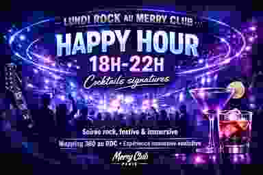 Début de semaine = bonne excuse pour sortir 😏🎸 Cette semaine, viens lancer le mood au Merry Club avec une soirée rock, festive et ultra immersive 🔥 Au RDC, découvre notre mapping 360 : une expérience visuelle immersive qui transforme totalement l’ambiance au fil de la soirée et des univers musicaux ✨ Un décor vivant, évolutif, surprenant… à voir absolument 👀 Au programme : 🎸 son rock 🍸 verres entre amis 🔥 ambiance festive ✨ immersion totale au Merry Et pour bien commencer : happy hour de 18h-22h cocktails signatures 🍹 Viens boire un verre, découvrir l’univers du Merry et démarrer la semaine dans une ambiance qui change vraiment des débuts de semaine classiques 🖤 PS. L'entrée est gratuite mais la reservation sera appreciée