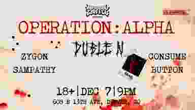 Boogie Groove Entertainment and Abyssal Cartel Present: Abyssal Cartel Presents Operation: ALPHA GENRE Experimental/Riddim/Tearout SUMMARY Happening at 21:00 on 12/7, this high-octane night is a full-scale mission into the world of bass and heavy beats. We've gathered an elite squad of artists to bring you an experience that’s nothing short of explosive. Headlined by the one and only Duble N, along with the power-packed lineup of Butt0n, Consume, Sampathy, and Zygon, this is an event you won't want to miss. Step into the heart of Operation: Alpha and immerse yourself in a sonic assault that blends mind-bending soundscapes with earth-shattering drops. Expect precision-crafted sound design, and a visual arsenal of cutting-edge lighting and lasers that will transform the venue into a high-intensity battlefield of sound and spectacle. This is more than just a show — it’s a mission. Come ready to witness the debut of a game-changing series of events, where every "Operation" will be a new chapter in the ultimate underground experience. TIME 9:00pm-2:00am Doors: 8:30pm AGE LIMIT 21+ ARTISTS Butt0n Consume Sampathy Duble N Zygon GET INVOLVED https://yourmomshousedenver.com/get-involved/