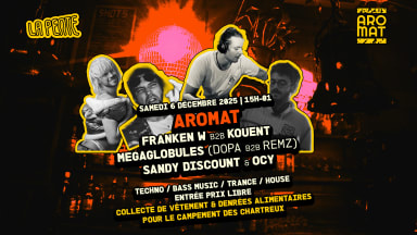 Jamais deux sans trois ! Aromat revient à La Pente pour vous réchauffer en ces temps hivernaux. Au programme, distribution d'épices en tout genre : house, techno, trance, bass, tribe... Pour l'occasion, une collecte de vêtements et denrées alimentaires sera organisée, afin de les redistribuer au campement des Chartreux (plus d'infos à venir). La soirée est à prix libre ; toutes les entrées seront reversées au collectif Soutien Migrants XR