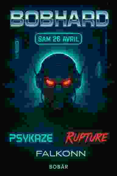 BOBHARD – L’IMPACT CYBERPUNK TECHNO TO UPTEMPO DE L’ANNÉE ! Prépare-toi à plonger dans un univers futuriste où la musique électronique prend le contrôle. SAMEDI 26 AVRIL – BÔBÂR Une nuit immersive entre néons, basses qui frappent et ambiance dystopique. Line-up de feu : PSYKAZE – L’énergie brute au féminin FALKONN – L’ombre qui fait trembler les murs RUPTURE – Le chaos masqué, imprévisible et ravageur ENTRÉE GRATUITE de 21H à 1H