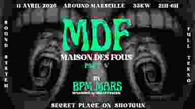 ⚫ MDF⚫ 🟢 MAISON DES FOUS Part. V 🟢 By BPM MARS 🏴‍☠️ 📅 11/04/2026 🕜 21H - 06H 📍 Line Up FULL TEKNO Acid Mental Tribe 🔊 Sound System 35 KW by MEGATONNERIE 🎛️ DJ/LIVER 🍻 FOOD & BAR 📸 Des photographes La Maison Des Fous, est un lieu où vous pourrez soigner vos maladies mentales les plus profondes, nos médecins et psychologues vous aideront à faire une introspection sur vous même, voyageant dans votre esprit jusqu'à votre plus tendre enfance afin d'effacer les traumatismes d'un passé parfois douloureux... Une salle blanche, avec en son centre un mur de son de 35Kw, de la TEKNO qui perce votre carapace mentale, des lumières traversants votre rétine jusqu'à votre esprit, et des boucles d'animations sur un écran géant pour vous remettre sur le droit chemin. Mais prenez garde, n'oubliez pas que vous êtes dans une Maison De Fous... Si vous êtes en bonne santé, cet endroit peut avoir un effet total inverse... et vous plongera dans une folie irréversible. ---------- LINE UP ------------ GEHLEKTEK IND And More -------------------------------- 🚮Surveille tes potes, ramasse tes poubelles. ♿ Accès pour personnes à mobilité réduite. ⛔ L'organisation condamne tous propos ou attitudes discriminatoires, racistes, sexistes ou homophobes. Le/la participant.e s'engage à avoir un comportement de respect et de bienveillance sous peine d'exclusion. 🎂 C'est ton anniversaire le 11 ou 12 Avril ? On t'offre l'entrée ! (Sur présentation d'une pièce d'identité physique uniquement) L'offre ne comprend pas les personnes nées le 10 ou 13 Avril 🏴‍☠️ STAY CONNECTED and RAVE ON ! 🌐 CONTACT Instagram : @BPM.MARS @MEGATONNERIE ~ Mention Légale ~ Toutes personnes achetant un billet se verront automatiquement devenir membre de l'Association BPM MARS pour une durée d'un mois. Cercle privé temporaire.