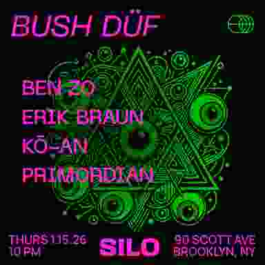 BUSH DÜF abducts SILO for an enthralling night of cosmic, colorful and cathartic techno. Ben Zo curates another finely-tuned sequence of DJs to steward the bar room's 15K-watt Danley sound system toward astonishing vistas both celestial and terrestrial. Opening our portal is Primordian, whose slippery ear for sludgy, spacey and arresting selections often have us swaying in unwavering suspense. We’ve heard him mesmerize on his 8-Ball Radio show as well as other stocky sound systems in Greenpoint, Coney Island and many places in-between. So him halting the chin-scratchers at open felt like a no-brainer for his venue debut. Kō-An (fka Luwan) leads us to midnight and beyond by sketching riveting sci-fi soundscapes of tunes brilliant and buoyant alike. Threading the oneiric edges of techno, tech house and other 4x4, among others, into consistently transportative experiences of spongy, somatic rhythms, we’re eager to have her as the second 8-Ball resident for the night in what’s also her SILO debut. Erik Braun then holds down the penultimate slot as our final first-timer at SILO. The Nul Records label lead and Heavy Waste co-founder is more than just a diligent and deep curator of fine techno through his Half Moon Radio residency and Redirect party series, but a head-turning mixer of hypnotic techno as thunderous as it is blissful. Ben Zo then closes with his entertaining intuition for cinematic set design across layered decks and lengthy loops. Harmonizing the familiar and esoteric into full-bodied blends that echo long after in thought, the DÜF director consistently crafts uniquely psychedelic spaces as suited to personal reflection as connecting with others.