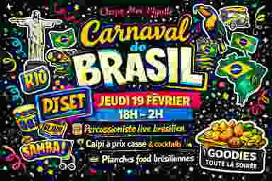 🇧🇷🔥 CARNAVAL DO BRASIL – CHOPE-MOI PIGALLE 🔥🇧🇷 Le Brésil débarque à Pigalle le jeudi 19 février pour une nuit 100% caliente 💃🏽🌴 Prépare-toi à vibrer au rythme de Rio avec : 🥁 Percussioniste live brésilien 🎧 DJ SET – vibes samba, baile funk & latino 🍹 Caipi à prix cassé & cocktails exclusifs 🥘 Planches food brésiliennes en mode street Rio 🎁 Goodies à gagner toute la soirée Ambiance carnaval, confettis, énergie solaire et chaleur tropicale jusqu’à 2H 🔥 📍 Chope-Moi Pigalle 🗓 Jeudi 19 février ⏰ 18H – 2H Le Brésil n’attend pas 🇧🇷✨