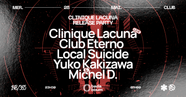 📍 Mercredi 28 Mai - 23h30/07h00 Club - Clinique Lacuna release party : Clinique Lacuna (live) (+) Club Eterno (+) Local Suicide (+) Yuko Kakizawa & Michel D. Capsule - TBA ________________________ 🎟 NOS TARIFS : Préventes avant minuit : 8€ Préventes avant 1h: 10€ Prévente all night long (Community) : 10€ Prévente all night long : 12€ Entrée sur place : 15€ FREE ENTRANCE FROM 4:30AM RÉSERVATION BOUTEILLE Contactez nous par mail : resaclub@badaboum.paris ou par SMS /Whatsapp only : 06 95 05 39 18 L’accès à l’événement est interdit aux personnes mineures. Une pièce d’identité pourra être exigée à l’entrée. L’établissement se réserve le droit de refuser l’entrée. The entry is forbidden to people under 18. An ID might be asked at the door. The venue reserves the right to prevent the entry. ________________________ 👉 INFOS PRATIQUES : Le Badaboum - 𝘊𝘭𝘶𝘣 - 𝘊𝘰𝘯𝘤𝘦𝘳𝘵𝘴 2 Rue des Taillandiers, 75011 Paris — Stations de métro proches : Bastille, Ledru Rollin, Voltaire - 𝘓𝘪𝘨𝘯𝘦𝘴 : 1, 5, 8, 9 — Bus : 46, 61, 69, 76, 86 ________________________ Pour une fête LIBRE, INCLUSIVE et plus SAFE. Au Badaboum, on entend offrir un lieu respectueux et tolérant pour tous, dans lequel notre public peut s’exprimer comme il le souhaite, à travers sa danse, son style, son univers. Tout comportement ou geste contrevenant à ces valeurs (par caractère homophobe, transphobe, raciste, misogyne, xénophobe, insultant…) entrainera automatiquement l'exclusion du club, assortie d'éventuelles poursuites auprès des autorités compétentes.