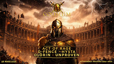 ⚔️ COLISEUM x INTERFERENCE ⚔️ Le 28 Mars 2026, COLISEUM vous invite entre les murs de la prestigieuse salle INTERFERENCE pour un show hors normes, tout en puissance. Au programme des hostilités : HYSTA, ACT OF RAGE, D-FENCE, UNPROVEN et OLÖRIN ! ⚔️ ⚔️ LINE UP ⚔️ ⚔️ ACT OF RAGE ⚔️ D-FENCE ⚔️ HYSTA ⚔️ OLÖRIN ⚔️ UNPROVEN ⚔️ TIMETABLE ⚔️ 23H50 - 01H30 : OLÖRIN 01H30 - 02H30 : ACT OF RAGE 02H30 - 03H45 : HYSTA 03H45 - 05H00 : D-FENCE 05H00 - 06H00 : UNPROVEN _________________________________ ☰ INFOS PRATIQUES LIEU : INTERFERENCE ADRESSE : 56 Rte de Lavaur, 31130 Balma OUVERTURE/FERMETURE : 23H59 / 06H00 TRANSPORT EN COMMUN : METRO A - Balma-Gramont FUMOIR EXTERIEUR XXL. CARTE D'IDENTITE OBLIGATOIRE. EVENEMENT INTERDIT AUX MINEURS. LA DIRECTION SE RESERVE LE DROIT D'ENTREE. RESPECT, AMOUR ET BIENVEILLANCE SONT MAÎTRES MOTS.