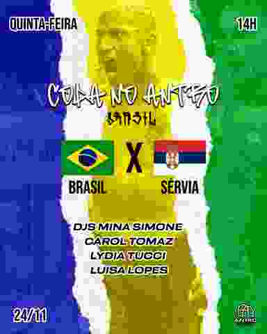 Litrão gelado, gente bonita, local seguro e música boa. Copa do Mundo é no Antro! Horário de Abertura: 14h. Brasil x Sérvia: 16h. Após o jogo nosso rolê plural e diverso nas vibes sonoras com as DJs mais brabas: - Carol Tomaz - Luísa Lopes - Lydia Tucci - Mina Simone * Para validar sua cortesia: Compartilhe o flyer oficial do evento nos stories marcando o @antroartebar + 2 amigos *