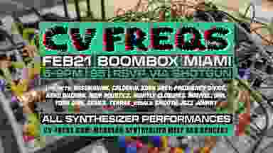 CV FREQS is a modular synthesizer meet and concert event open to all synthesizer enthusiasts! MODULAR MEET AND LIVE CONCERT, 5–9PM, Live acts: Owl Yohn Gain, MGM Aquatics, Bassmarine, Kako Guzman, Calderin, Nosivel, Frequency Divide, Eden Grey, Terras, Nightly Closures, Series Visuals: Smooth Jazz Johnny The concept behind CV FREQS is simple: to bring together Eurorack and synthesizer users and strengthen the modular synthesis community in Miami. If you’re a modular synthesist, you’re welcome to bring your Eurorack system to show and demo at the meet. Please bring a table for your gear, a speaker or two (or headphones if you prefer), and a power strip. Curious about Eurorack modular synthesizers? Come turn a knob or patch a cable to the systems on exhibit—just ask the exhibitors first! This is a great opportunity for modular synth fans to connect, share patching ideas, and explore the unique sounds created with different modules. We can even sync our clocks and have a jam! CV FREQS is an inclusive modular synth meet and concert for all enthusiasts, organized and hosted by Eden Grey. The series began in London (2016–2019), with earlier events in Portland, OR (2013), and more recently in Columbus, OH (2021–22). After five years, we returned to London at Metamorphika Studio in May 2025! Looking ahead, 2026 is shaping up to be even more inspiring, with a truly global vision. For all the details about the CV FREQS community, visit https://cv-freqs.com. This event is presented in collaboration with The Boombox and EC Underground.