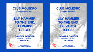21+ FREE SHOW Doors 5pm, 9pm start time Club Moledro returns to Danger Danger with deep grooves and exquisite dance floor vibes, with an all-new lineup featuring Lily Hammer, To The End., DJ Varist, and Teecee. In collaboration with Sailor Munchies and DJs Against Apartheid. 100% of the proceeds will be donated to DJs Against Apartheid.