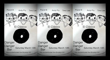 21+ FREE SHOW Doors 5pm, 10pm start time Danger Danger is thrilled to welcome Andy Pry Ortega (Tiki Disco), Planet B, and Timo Lee (Chomp Chomp Records) to the decks to kick off the first installment of El Clásico - a new regular party that will have you moving all night long to exceptional grooves with some of the most gifted DJs in the city. Come dance with us!