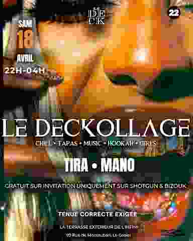 LE DECKOLLAGE –  LE DECK  Tous les samedis  22h00 – 04h00 On se retrouve dans ton nouveau spot extérieur au Gosier. Sur ton deck préféré on va enfin pouvoir profiter, chill , fumer une chicha , boire un cocktail, fêter entre amis Toujours la vibe que tu préfères : Hip-Hop & Caribbean Music. Nos résidents aux platines : DAFMAN • KEVY • LISTENDAT • TIRA • PELUCHE • MICKA • DOSKY • MANO Interdit au moins de 22 ans . Tenue correcte impérative . PAS DE JOGGING • PAS DE SACOCHE La direction se réserve le droit d’entrée Terrasse de L'Infini , Le Deck , 99 route de Montauban Gosier