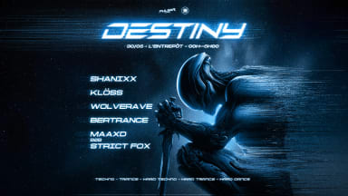 🌠 DESTINY 🌠 🗓️ 30 Mai 2025 | 🕙 00h - 06h |📍L'Entrepôt Neuf mois de montée en puissance, de lieux spéciaux, de nuits fiévreuses, de pulsations toujours plus fortes. Ce soir-là, Destiny verra le jour. Pour de vrai. Pour de grand. Et pour ça, on investit le sanctuaire ultime de la techno bordelaise pour écrire une nouvelle page de notre histoire. 🔊 Techno • Trance • Hard Trance • Hard Dance • Hard Techno Line-up galactique : ✨ MAAXD B2B STRICT FØX ✨ BERTRANCE ✨ SHANIXX ✨ WOLVERAVE ✨ KLÖSS La soucoupe atterrit. L’épée est dégainée. Notre destin s’écrit ici. 🔮