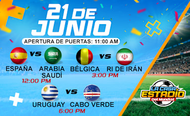 Celebra la fiesta del Mundial con los lesperados encuentros España vs Arabia Saudita /Bélgica vs Irán y Uruguay vs Cabo Verde, en un entorno diseñado para vibrar cada minuto como si estuvieras en el estadio.