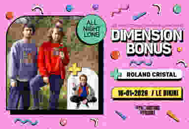 Une soirée de rentrée (All night long) pour les amateurs de BPM rapide et de paroles délirantes avec les sulfureux DIMENSION BONUS (Ex Salut c'est cool) et L'ovni ROLAND CRISTAL. Une ambiance aux limites du cosmique, parfois étrange, parfois improvisée pour un voyage assuré sur le dancefloor ! Des surprises sont prévues...