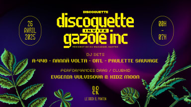 Dans la moiteur des nuits nantaises s’érige depuis 2017 un temple de la musique électronique : le Macadam. 🪩✨ Et dans ce temple, de grands-messes queers sont célébrées, réunissant le meilleur de la scène club LGBTQI+ locale et internationale : les soirées Pinkwashing. 🌈 Le collectif derrière ces programmations ambitieuses et toujours bien pensées n’est autre que Gazole Inc, mené par les excellent·es DJs Paulette Sauvage et OR’L accompagné·es de l’artiste pluri-disciplinaire France Parsus, que nous avons l’honneur de recevoir ! 💞 Dans leurs valises, Gazole Inc nous ramènent le club kid Kidzmoon : clown plasticien, artiste visuel, Kidzmoon est avant tout un grand enfant terrible qui aime jouer entre les zones troubles de l’identité et du genre. 🤡💅🏼 Pour compléter l’affiche, nous avons invité Evgenia Vulvisova, performeuse branchée sur prise électrique, qui avait illuminé la scène ouverte de notre Kiki Pride l’an dernier au Mazette ! 🏳️‍🌈🏳️‍⚧️ Enfin, nos DJs résident·es Nannä Volta et A-440 s’occuperont d’accueillir tout ce beau monde derrière les platines. 💿⚡ DJs : OR’L https://www.instagram.com/or.ldj/ https://soundcloud.com/orl Paulette Sauvage https://www.instagram.com/paulette_sauvage/ https://soundcloud.com/paulette-sauvage Nannä Volta https://www.instagram.com/nanna_volta/ https://soundcloud.com/nannavolta A-440 https://www.instagram.com/cpa.440/ https://soundcloud.com/a-440-music Performers : Kidzmoon https://www.instagram.com/kidz_moon/ Evgenia Vulvisova https://www.instagram.com/evgeniavulvisova/ INFOS PRATIQUES 📍 1 place de la Pointe, 93500 Pantin ⏰ Samedi 23 Novembre, de 00h à 7h 🎫 12 - 14 - 16€ 🌈 La Discoquette est une soirée queer qui prône le respect, la tolérance et l’inclusivité. Aucun propos ou comportement discriminatoire, raciste, sexiste ou LGBTQI-phobe au sein de nos événements y est toléré. 🫂 Notre lieu se veut inclusif et bienveillant, nous ne tolérons aucune forme de discrimination 🫂 🔊 Nous vous invitons à signaler à notre staff tout comportement inapproprié lors d’une soirée. 🔊