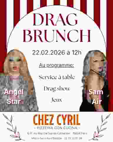 ✨ DRAG BRUNCH ✨ Ce dimanche 22 février à 12h, rejoignez-nous chez Chez Cyril pour un brunch festif avec Angel Star & Sam Air. Brunch gourmand, show drag, jeux et ambiance festive au cœur du Marais. Places limitées — pensez à réserver. #DragBrunch #BrunchParis #ChezCyril #MaraisParis