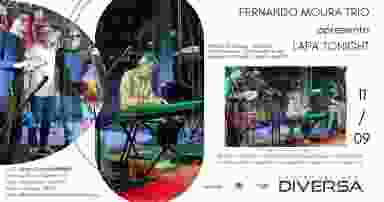 Fernando Moura Trio apresenta Lapa Tonight Repertório autoral com instrumentais e arranjos especiais para trilhas de cinema incluindo performances únicas com projeção de imagens ao vivo em tempo real. Fernando Moura, teclados Jovi Joviniano: percussão e voz Augusto Mattoso: baixo acústico Local: Centro Cultural Diversa Endereço: Rua da Carioca 54 A Data: 11 de setembro de 2025 Abertura da casa: 20h30 Ingresso: R$ 20,00 antecipado R$ 25,00 na porta. Rider técnico: