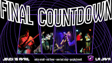 FINAL COUNTDOWN Parce que toutes les bonnes choses ont une fin, parce que cette fin doit être grandiose, parce que c’est vous qui faites battre sciencesconcert, on vous a préparé un dernier concert, le dernier des derniers avant une retraite bien méritée pendant l’été RDV le 16 avril à la Java, avec non pas un, ni deux, ni trois mais bien tous nos quatre groupes pour ce concert exceptionnel. Alors si tu as aimé Red Fever, One last stop, Purple Revolt ou encore Extra Small, rejoins nous pour cette dernière danse qui s’annonce déjà hors du commun. Toi, nous, de la bonne musique, la solution à une équation parfaite. Un dernier décompte mais le début d’une nouvelle histoire.
