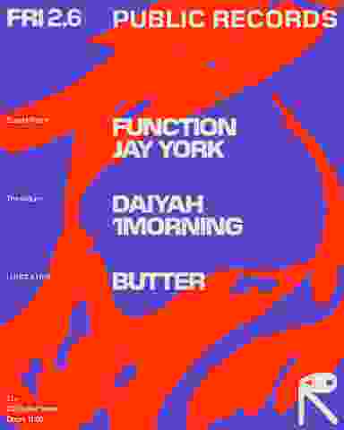 One of the most illustrious names in techno steps into our booth for the first time. Function, the moniker of Brooklyn-born, Berlin-based David Sumner, began his determined career as a resident of Limelight before solidifying his name on the global scale as a founding member of Sandwell District collective with Regis and the late Silent Servant. His ear as a producer and label owner [Infrastructure New York] gleams with a pummeling-yet-polished intensity. Tonight, a mesmerizing blend of refined rhythms, rolling kicks, and a procurement of contemporary techno. Jay York steps in to open the room. New York mainstay DAIYAH debuts in The Atrium. Her unbridled DJ sets lean hard and dark, bringing a fresh voice to landmarks in NYC, Berlin, Detroit, and beyond while pushing the genre forward with fresh lineups for her own event series RNR. 1morning drives the room with a funkier momentum. His vinyl sets present the rugged edge of old-school, mixing crunchy low ends and hard chops with new-school finesse. The Mixtape Club’s’ Butter, who has been organizing parties, hosting radio shows, and working in record stores, since the '90s, handles the vibe UPSTAIRS. - Public Records aims to provide a safer space. We reject all forms of discrimination, including racism, misogyny, transphobia, homophobia, sexism, and other aggressive behavior. Consent is paramount. Please exist with respect for yourself and those around you. Anyone found in violation of our rules or safer space policy will be removed from the venue. To share feedback about an incident, please email hello@publicrecords.nyc or alert a member of our team. Tickets may be available at the door based on capacity. A ticket does not guarantee entry; admission into the venue, including UPSTAIRS, is subject to the discretion of our staff. All large bags + coats must be checked. Doors close at 3 AM.