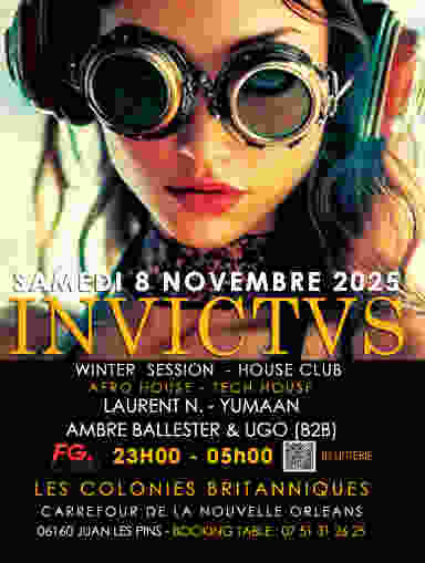 "INVICTUS" Winter Session House & Afro House - Tech House New Place - House Club - Best Sound System ** Laurent N. ** Résident **Yumaan** **Ambre Ballester & Hugo B2B** A partir de 23H00 jusqu'à 05h00 Entrée : 15 euros Réservations Table : 07 51 31 26 25 Les Colonies Britanniques (derrière Le Village Club) Carrefour de la Nouvelle Orléans 06160 Juan les Pins