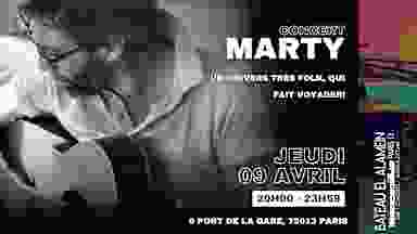 Accompagné sur scène de son instrumentarium (guitare folk, banjo, mandoline, weissenborn, scie musicale et ukulélé) il interprète ses propres chansons nées d’une riche collaboration avec des auteurs qui lui sont chers S.Mimoun (Debout sur le Zinc), P.Lebas (La Ruda), C.Garau et son frère Eric Marty.