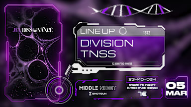 ⛓️ Jeudi 5 mars ⛓️ Les Jeudissonance , la hard techno réservée aux étudiants. Le collectif Clermontois Dissonance lance Les Jeudissonance, un nouveau rendez-vous dédié à la scène étudiante, où la hard techno devient un exutoire en pleine semaine. Un format brut, intense, pensé pour celles et ceux qui veulent lâcher la pression de la semaine et plonger dans l’univers sombre du collectif. Pour cette première édition, TNSS et D!VISION, deux DJs du collectif, prennent les commandes. Des sets hard techno sans compromis pour faire dissonner la semaine. ________________________________________ 🎵 LINE-UP ▀▀▀▀▀▀▀▀▀ ⚡️ D!VISION ⚡️ TNSS ____________ 📍 INFOS PRATIQUES ▀▀▀▀▀▀▀▀▀ 🗓️ Date : Jeudi 05 Mars 2026 🕒 Horaires : 23h45 – 06h00 🎫 Préventes prioritaires jusqu’à 1h ⚠️ Nombre de préventes limitées ! ⚠️ Fermeture billetterie en ligne à 23h30, entrée sur place possible 📍 Lieu : Middle Night — 12-14 Rue Ramond, Clermont-Ferrand 🚋 Tram : Arrêt Lagarlaye (2 min à pied) 🚗 Parking : Centre Jaude 1 (5 min à pied) La nuit est à vous, vivez-la sans excès !!! Celui qui conduit, c’est celui qui ne boit pas. L’abus d’alcool est dangereux pour la santé, à consommer avec modération.