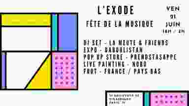 L'Exode, successeur du 45 Tours, vous invite dans un nouveau spot de plus de 300m2 à l'intérieur et plus de 100m2 de terrasse pour son premier événement musicale, et ça tombe bien car on a choisi la Fête de la musique ! Parallèlement, nous vous présenterons les différents domaines que nous explorerons à travers ce nouvel espace! ❤️ AU PROGRAMME ❤️ 🎧 DJ Set - La Meute Crew & Friends La Meute, collectif activistes parisiens, créateurs de déhanchés s'occuperont de vos oreilles en compagnie de Gaumars, Kestudi & Noch (du collectif El Hey) ✨ LA MEUTE Dj’s SC : https://soundcloud.com/la-meute-paris IG: https://www.instagram.com/lameutecollectif ✨ GAUMARS SC: https://soundcloud.com/gaumars IG: https://www.instagram.com/margauxbz/ ✨ KESTUDI SC: https://soundcloud.com/kestudiparis IG: https://www.instagram.com/kestudiparis/ ✨ NOCH ( EL HEY) SC: https://soundcloud.com/noch_music IG: https://www.instagram.com/noch_dj/ 🧑‍🎨 Expo - DABOULISTAN Né en 1998 à Lyon, Daboulistan commence le graffiti à l'âge de 13 ans, dans la cour du collège puis dans la rue, il ne cesse d'y imposer ses couleurs, son blaze ces équipes. TP "tu penses" PLS"position latérale de sécurité" Et SLF "Super low Frequency". Menuisier de métier il débarque à Paris en 2017 dans le but d'exercer celui-ci. De nouvelles rencontres vont lui offrir de nouvelles perspectives, tel que la peinture sur toile sans quitter son œuvre à l'extérieur IG: https://www.instagram.com/daboulistan 👯‍♂️ POP UP - PRENDSTASAPPE Passionné du vêtement Vintage depuis plus de 10 ans, prendstasappe vous propose un large choix de style, allant de la veste en jean, en passant par de la jacket en cuir , le sweat sport à la chemise de travail dickies en passant par la veste universitaire .. et cela, pour plaire au plus grand nombre, les messieurs et les dames. IG: https://www.instagram.com/prendstasappe/ 🎨 LIVE PAINTING - NOBO Nobo ravalera la façade avec tout son art en direct IG: https://www.instagram.com/nobo_street/ ⚽ FOOT - FRANCE / PAYS BAS Pour les footeux, sur grand écran ~~~~~~~ INFOS PRATIQUES ~~~~~~~ 🎫 Evènement GRATUIT & Prix Doux au bar Free Pass Shotgun => https://shotgun.live/events/lowkey-records-le-45-tours - Vous pourrez diner sur place en dégustant les pizzas maison de la casa - Direct Live sur Twitch & Facebook à partir de 18h! 🖲 L'Exode 39 Boulevard de Strasbourg, 75010 Paris Infos/ Réservations: ☎: 0665674039 @: lexode.paris@gmail.com Métro : Ⓜ⑧, ⑨ : Strasbourg Saint Denis Ⓜ 4: Chateau D'Eau