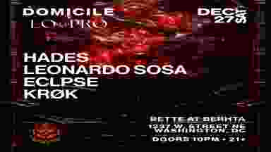 LO PRO x Domicile: HADES at Berhta LO PRO teams up with Miami’s own Domicile to bring an unrelenting night of hard techno to Berhta — DC’s premier warehouse venue. Headlining the night is HADES, delivering their signature dark, high-intensity sound built for the underground. This collaboration merges two of the most respected names in the hard dance community, uniting Miami’s raw energy with DC’s thriving rave scene. Expect a full night of pounding rhythms, hypnotic atmospheres, and pure warehouse immersion. Lineup: HADES ECLPSE KROK Leonardo Sosa THIS EVENT IS 21+ ALL TICKET SALES ARE FINAL