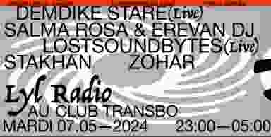 LYL Radio est bouillant de vous inviter pour sa première soirée au Club Transbo, le Mardi 7 Mai (veille de jour férié), de 23h à 05h avec un line-up paré pour la teuf. Pour cette belle occasion, nous vous présentons un live du légendaire duo anglais Demdike Stare (fondateur de DDS, affiliés de longue date à Modern Love), mêlant drum'n'bass et techno, ainsi qu'une nouvelle performance modulaire du Bruxellois Lostsoundbytes (fondateur du label Lost Dogs Entertainment) entre bass music, électro, trap et plus. Pour accompagner ces lives, un warm-up à 4 mains entre Erevan DJ & Salma Rosa, un set de la killeuse hollandaise Zohar en peak time et notre local et cher Stakhan, pour clore tout en trance cet évènement.