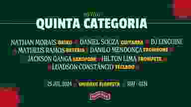 Descubra o Jazz Experimental e as Brasilidades na Mascate Floresta! Venha curtir uma noite incrível na Mascate Floresta, onde o jazz experimental se encontra com os ritmos brasileiros na energia contagiante da banda Quinta Categoria. Prepare-se para uma fusão musical que vai mexer com seus sentidos e te levar por uma viagem única de improvisação e ritmos envolventes. Não perca essa oportunidade de vivenciar um evento cheio de música boa e atmosfera acolhedora. Garanta já o seu ingresso e junte-se a nós para uma noite memorável na Mascate Floresta! - Quinta Categoria - DJ Linguini Reserve seu lugar e venha celebrar a música que transcende fronteiras e alegra corações. Não fique de fora dessa! ***Os aniversariantes que celebrarem na semana de 21/07 a 28/07 tem condições especiais! É gerado um link para enviar aos seus convidados e: a cada 5 ingressos vendidos no link, ganha 01 cortesia | a partir de 15 ingressos ganha 01 combo de latas de Xeque Mate. Mais informações no WhatsApp: +55 31 99250-9642